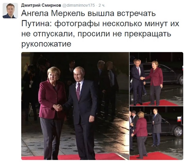 "Немецкие церемонии: Путин и Меркель трижды пожали руки при встрече", – написал Смирнов.