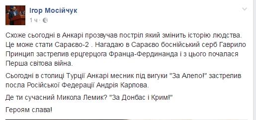 "Похоже сегодня в Анкаре прозвучал выстрел который изменит историю человечества. Это может стать Сараево-2 . Напомню в Сараево боснийский серб Гаврило Принцип застрелил эрцгерцога Франца-Фердинанда и с этого началась Первая мировая война.