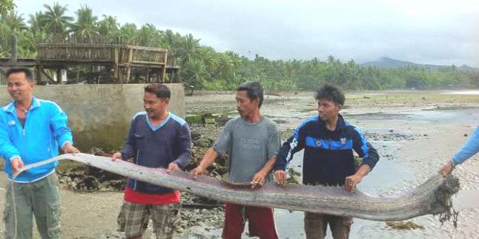 Филиппинским рыбакам удалось выловить самую длинную из костных рыб из семейства Ременетилих (Regalecidae), ряда Лампридоподибных (Lampriformes). Селедочный король хохлатый - или ремень-рыба. Данный вид обитает на глубинах до 1000 метров.