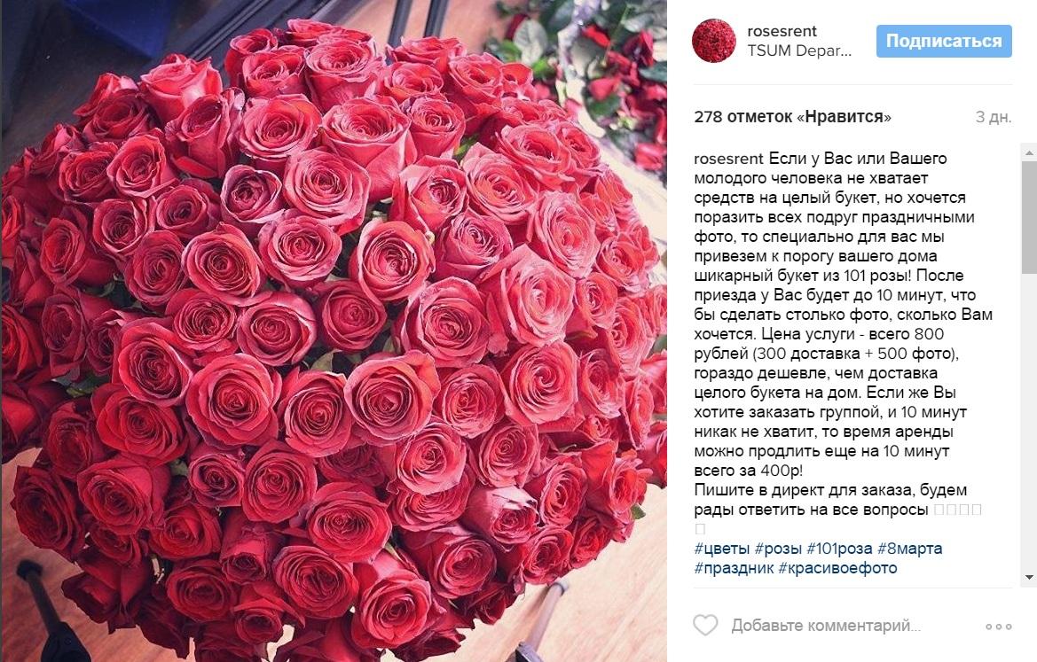 Только у нас вы можете заказать аренду букета из 101 красной розы, чтобы сделать отличные праздничные фото и поразить всех своих подруг. Нет нужды тратить большие суммы или ждать, просто напишите в личные сообщения и получите букет к порогу вашего дома всего за 700 рублей. У вас будет 10 минут, чтобы сделать фотографии с разных ракурсов и позиций", - говорится в объявлении одного из сервисов.