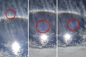 Шар сначала находился выше радуги, затем опустился ближе к Солнцу, переместился правее его и исчез. В последнее время подобные светящиеся объекты появляются около водоемов, поэтому тарелки пришельцев увидеть очень сложно.