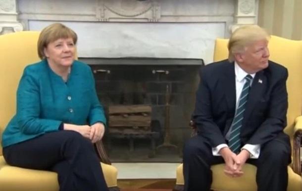 Канцлер Германии спросила американского президента, хочет ли он пожать руку, однако тот в ответ молча смотрит перед собой.