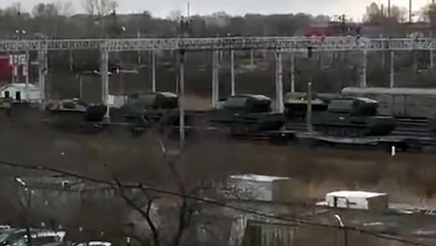 На видео можно рассмотреть один из трех поездов, загруженных военной техникой, движущийся к сухопутной границе протяженностью 17 км между Россией и КНДР.
