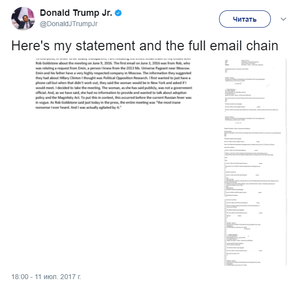 Именно переписку с Голдстоуном Трамп-младший опубликовал в своем аккаунте в Твиттере, передает Час Пик.