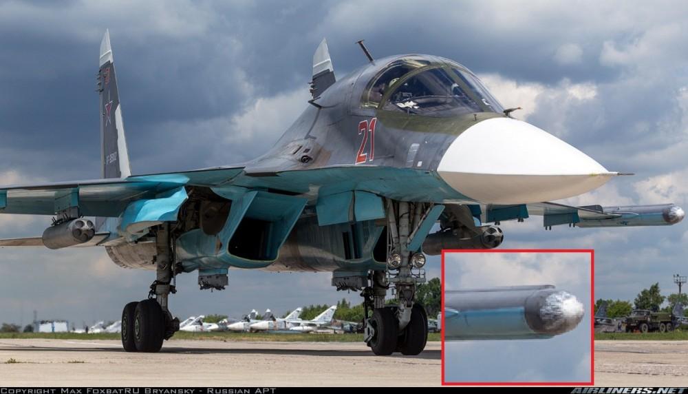 Истребитель-бамбардировщик Су-34 производства РФ имеет толстый слой скотча на комплексе РЭП. Назначение этой "технологии" пока выяснить не удалось.