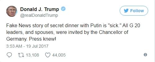 Глава Белого дома оставил в своем Twitter комментарий по этому поводу, раскритиковав работу американских журналистов, новость передает Час Пик. Дональд Трамп назвал данное заявление «тошнотворным фейком» и добавил, что новости становятся все более "бесчестными". Он пояснил, что на "секретной встрече" с Путиным были все лидеры G20 и пресса об этом была уведомлена.