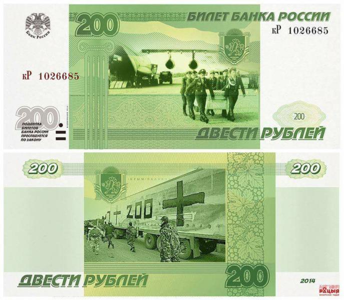 Однако возмущенные наглостью оккупантов украинцы предложили более «подходящий» вариант дизайна банкнот, обыграв цифру «200». Так, в сети появилась фотожаба, где вместо крымских памятников на рублях изображен «груз 200», возвращающийся в Россию из горячих точек.