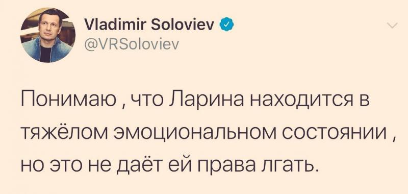Однако Соловьев за словом в карман не полез и в довольно резкой форме овинил обозревателя Ларину во лжи.