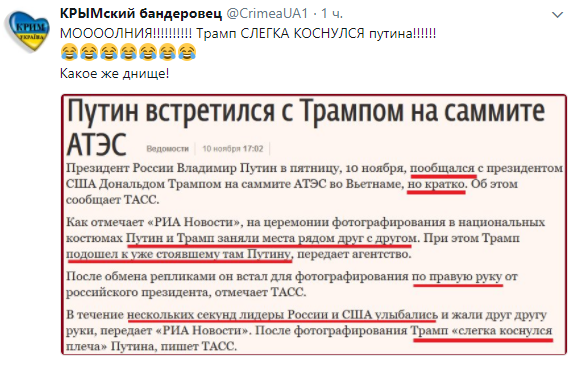 Российские СМИ радостно тиражируют новость о встрече Владимира Путина с Дональдом Трампом во Вьетнаме на саммите АТЭС. Даром, что эта встреча продлилась несколько секунд - событие стало поводом многочисленных шуток в сети.