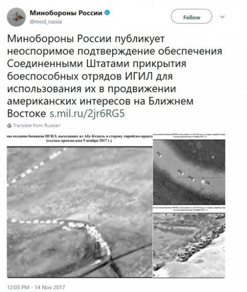 Во вторник, 14 ноября, Министерство обороны РФ, опубликовало «неоспоримое подтверждение» сотрудничества США с «Исламским государством (ИГИЛ)». Однако, спустя время, пост был удален, так как оказался фейковым. Британский журналист Элиот Хиггинс, просматривая снимки-доказательства, уличил российских военных во лжи. Блогер написал в Твиттере, что представленные кадры взяты из мобильной игры «AC-130 Gunship Simulator: Special Ops Squadron».