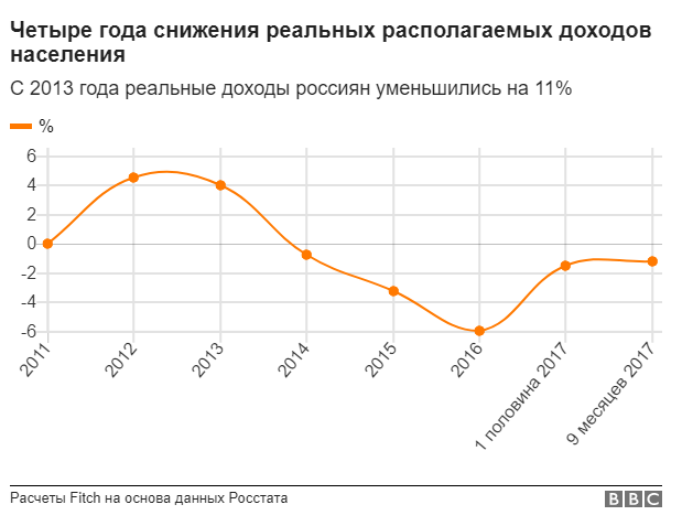 В целом с 2013 до 2017 года реальные располагаемые доходы россиян снизились на 11 процентов. Наиболее стремительное снижение доходов – на 5,9 процентов – наблюдалось в 2016 году.