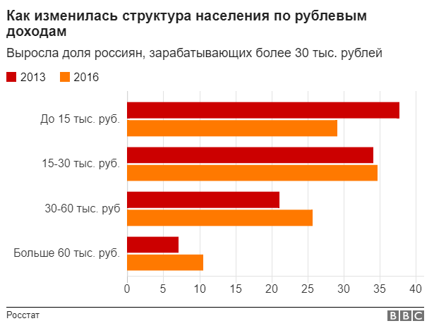 В то же время количество россиян, зарабатывающих более 30 тыс. руб. в месяц, в последнее время возросло, а граждан, зарабатывающих менее 15 тыс. руб., стало меньше. Однако в долларовом эквиваленте все не так радужно: обвал рубля сильно обесценил доходы населения. Так, в 2016 году гораздо больше россиян стали зарабатывать менее, чем 220 долларов в месяц. В связи с этим упала покупательная способность граждан.