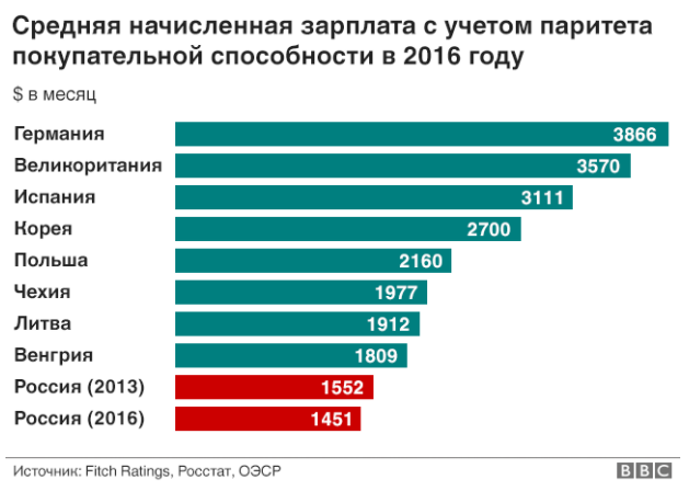 Особенно заметно обнищание населения РФ, если перевести российские зарплаты в доллары. Количество граждан, чьи доходы ниже среднего, возросло на треть, на столько же уменьшилось число россиян, умеющих доходы выше среднего.
