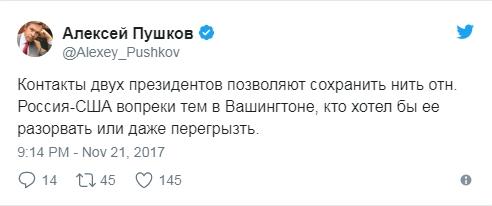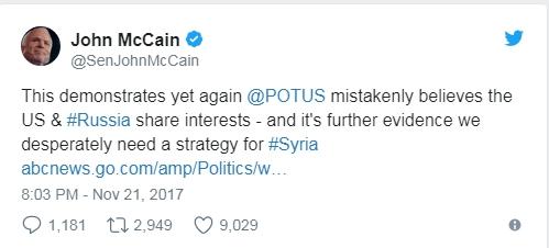 В тоже время, беседу президентов США и России раскритиковал Сенатор Джон Маккейн. Он считает диалог с Москвой ошибкой и заявляет, что Трамп ошибочно верит в общие интересы двух стран.