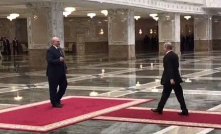 Это случилось в резиденции Президента Беларуси Александра Лукашенко в Минске во время встречи двух лидеров. Журналисты расположили по бокам от красной ковровой дорожки камеры, по которой оба политика, участвующие в саммите Организации Договора о коллективной безопасности (ОДКБ), входили внутрь.