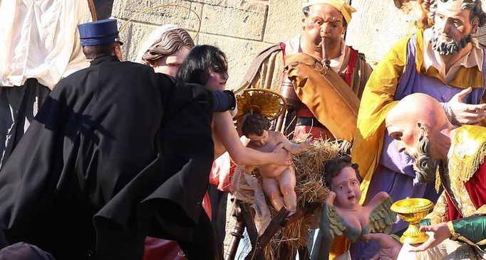 Итальянская полиция, в свою очередь, сообщила, что в ночь на вторник, 26 декабря, в Риме была задержана активистка Femen, которая пыталась похитить статуэтку "дитя Иисуса" из рождественского вертепа на площади Святого Петра в Ватикане. На спине полуобнаженной активистки красовалась надпись God is a woman ("Бог - женщина").