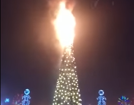 На видео видно, что елка загорелась сверху. По какой причине это произошло пока неизвестно, но очевидцы сообщают, что в нее бросили петарду.