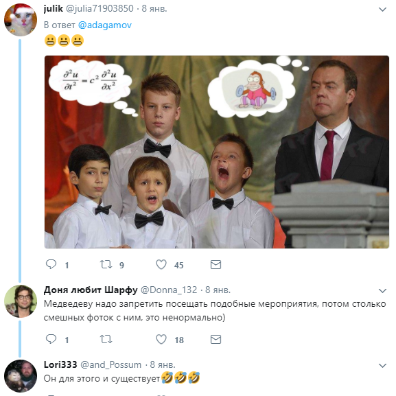 В комментариях предложили запретить Медведеву посещать такие мероприятия, потому что почти каждый раз интернет «взрывается» от обилия смешных фотографий. Также пользователи предположили, что батюшка-ФСБшник при помощи наушника поддерживает связь с богами Олимпа, а уживаться разноверцам супругам Медведевым помогают наворованные деньги.