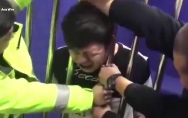 В Китае мужчина, которого доставили в отделение полиции, просунул голову между прутьями решетки. В результате он застрял и начал плакать.