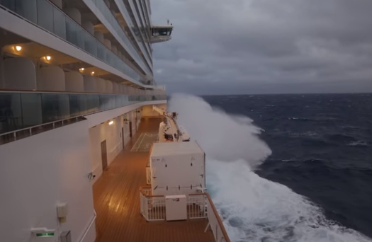 В зимний шторм корабль попал на обратном пути. Капитан не стал отклоняться от курса, чтобы обойти циклон. Один из пассажиров снял на видео, что происходило в это время за бортом и на корабле: лайнер сильно качало на огромных волнах, на палубах везде была вода, которую непрерывно пытались убрать.