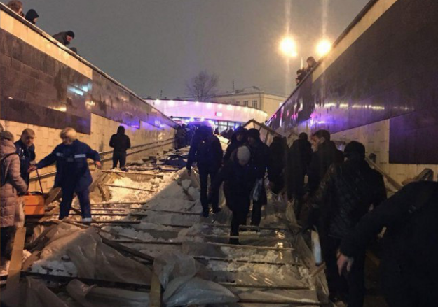 В центре Москвы на подземный переход в районе улицы "1905 года" строительные леса обрушились на прохожих. Российские СМИ сообщают, что есть пострадавшие.