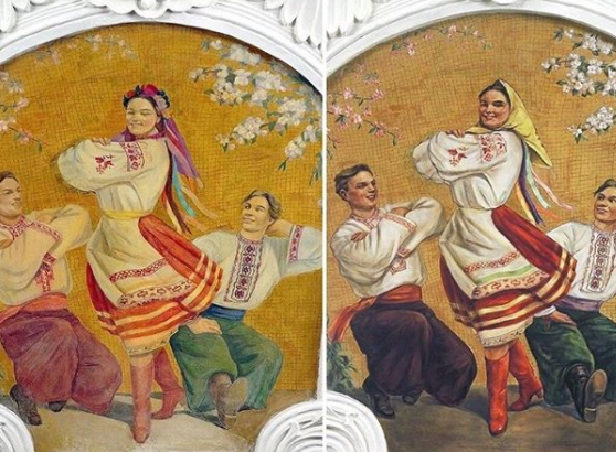 В российской столице оригинальным образом "деукраинизировали" станцию метро "Киевская", приресовав девушке на фреске вместо венка косынку.
