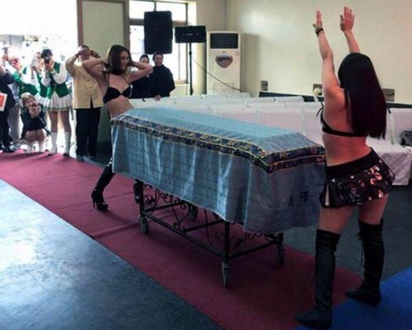 Для этого на церемонию приглашают актеров, певцов, танцоров и музыкантов. Особой «изюминкой» похорон становятся стриптизерши, которые нередко полностью раздеваются, развлекая участников похоронной процессии.