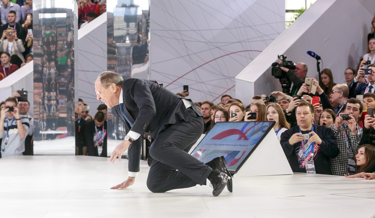 Министр иностранных дел РФ Сергей Лавров споткнулся, поднимаясь на главную сцену форума «Россия — страна возможностей».