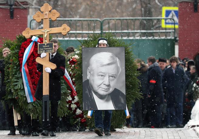 Попрощаться с гениальным актером пришли друзья, ученики, коллеги и многочисленные почитатели таланта Табакова. Вокруг МХТ имени Чехова собралось много людей, которые пришли проводить любимого артиста в последний путь.
