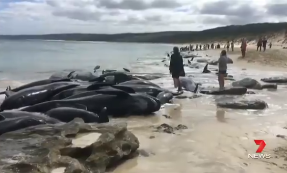 Western Australia: More than 150 whales have beached themselves near the south-west town of Augusta. Parks and Wildlife staff are on-site to save the 75 animals still alive. #7News pic.twitter.com/I1O1yxwhrM