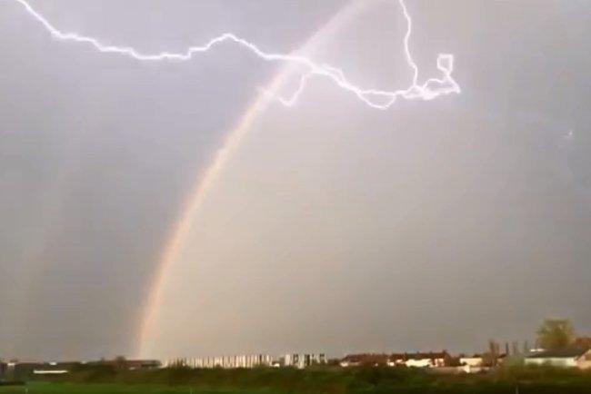 Над британским городом Бриджуотер в графстве Сомерсет разразился грозовой шторм и местная жительница Меган Тейлор решила заснять на видео молнии на фоне огромной радуги в небе над городом, сообщает Час Пик.