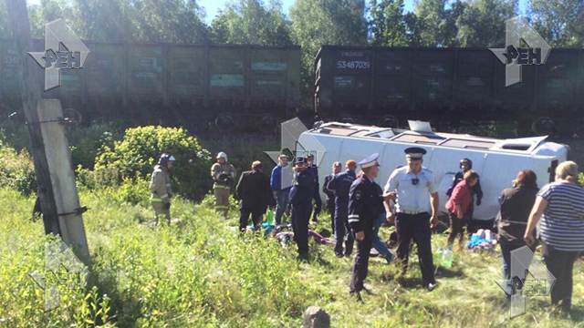 Сообщается, что автобус попытался проскочить перед груженым рудой поездом, однако не успел, и на переезде произошло столкновение.