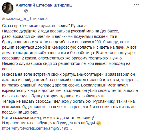 Позже стали известны подробности кровавого происшествия. Убийцу зовут Руслан, ему 26 лет. Более двух лет он защищал "русский мир" на Донбассе, а когда вернулся, начал проявлять немотивированную агрессию.
