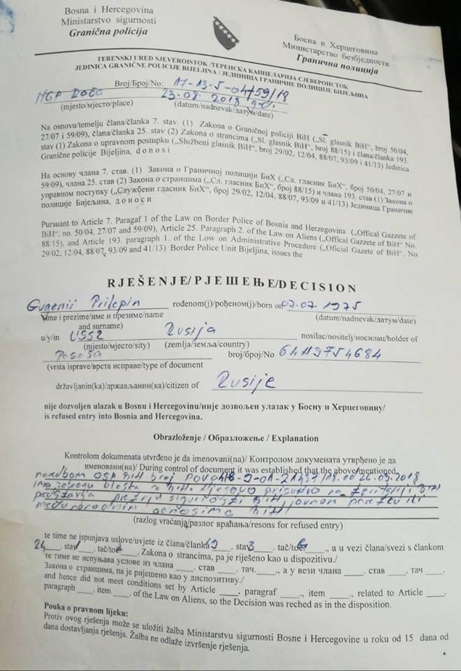 Основание - официальная бумага министерства безопасности Республики. С 26 марта 2018 года мне запрещён въезд на территорию Боснии и Герцоговины. Моё присутствие несёт угрозу государственности и международным отношениям.