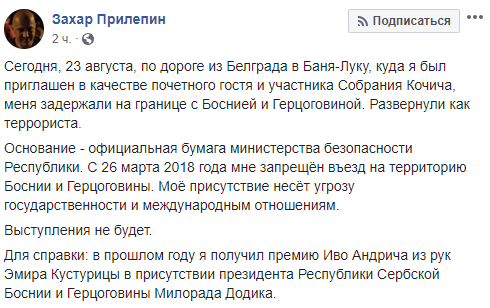 "Сегодня, 23 августа, по дороге из Белграда в Баня-Луку, куда я был приглашен в качестве почетного гостя и участника Собрания Кочича, меня задержали на границе с Боснией и Герцоговиной. Развернули как террориста.