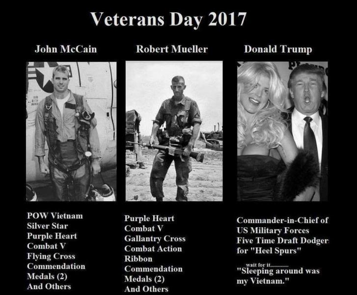 После Вьетнама Маккейн и Мюллер служили своей стране (один в Конгрессе, другой в ФБР), а Трамп в это время отмывал русские деньги в своих казино в Вегасе и в своих башнях.