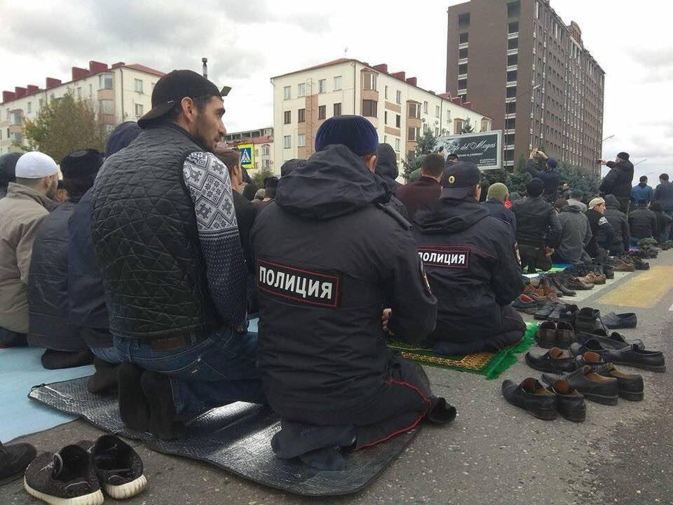 Как уже сообщалось, ингушский ОМОН отказался выполнять приказы властей и не пропустил в Магас военных.Также в сети появились фото, на которых показано, как силовики совершают утреннюю молитву (намаз) вместе с протестующими.
