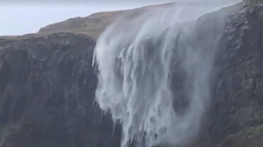 Там местный житель снял на видео, как мощный ветер сдувает водопад вверх. Необычное зрелище имело место на острове Скай на западе Шотландии.