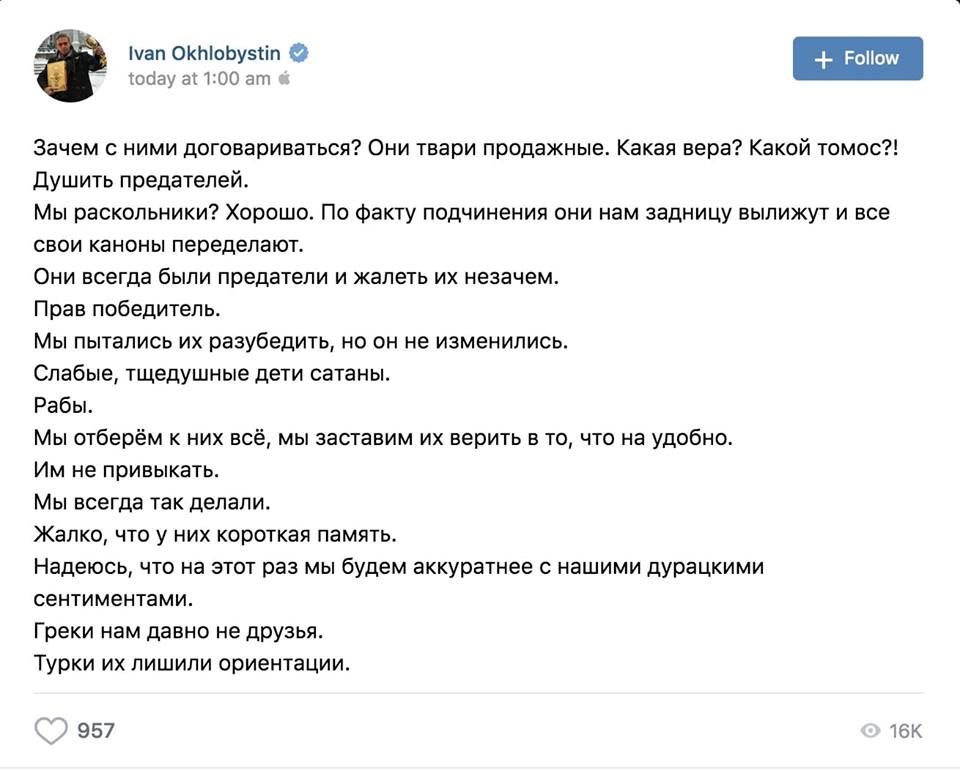Скандальный российский актер и бывший священнослужитель Иван Охлобыстин поддержал вчерашнее решение Синода РПЦ о разрыве отношений с Константинополем, назвав представителей данного патриахата "детьми сатаны" и "продажными тварями".
