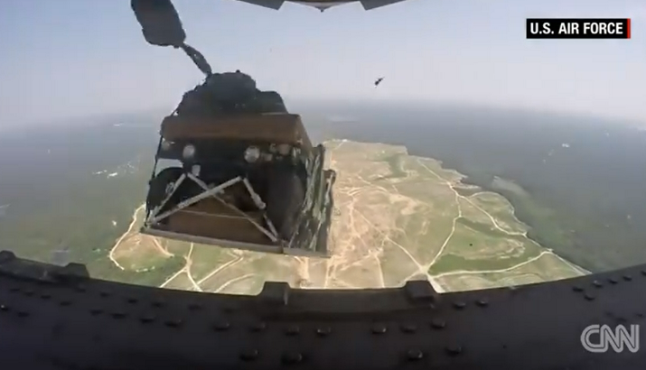 По какой-то причине платформа сработала на минуту раньше, и сброс Humvee произошел в сельской местности. Жертв и разрушений нет.