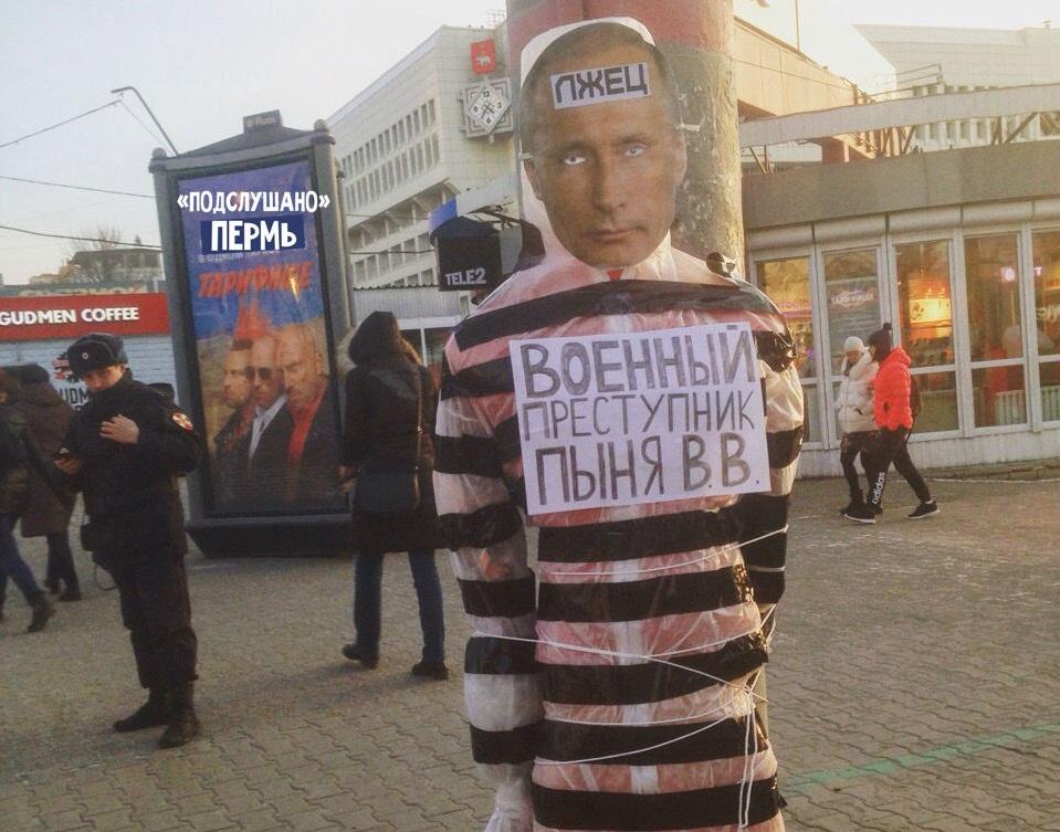 Вчера, 11 ноября, в российской Перми неизвестные установили на столбе возле ЦУМа чучело с лицом президента страны Владимира Путина, "одетое" в костюм заключенного. Фото с места событий опубликовали очевидцы в одном из социальных пабликов.