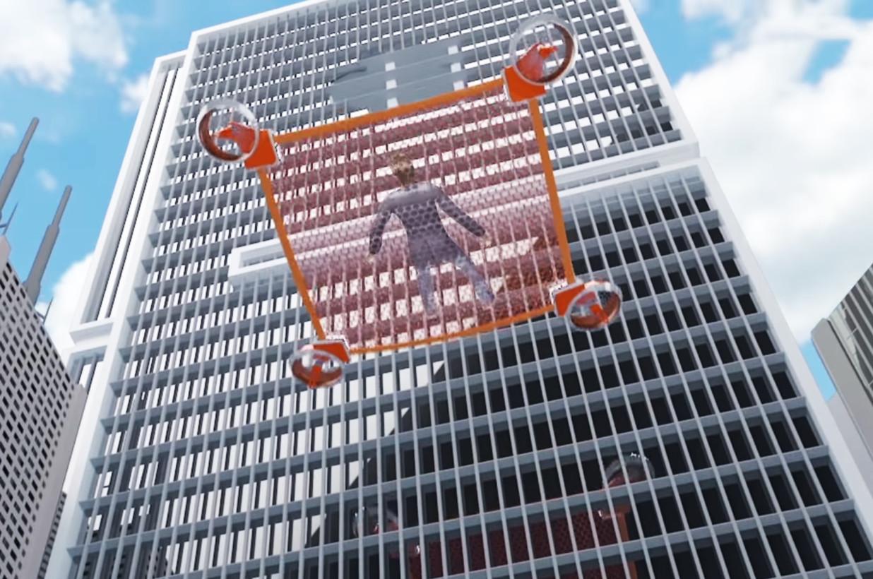 Идея здесь заключается в том, что дроны будут расходиться, удерживая при этом сеть. Она может использоваться для перевозки людей, которые оказались в ловушке на высоких местах, таких как горящие здания.