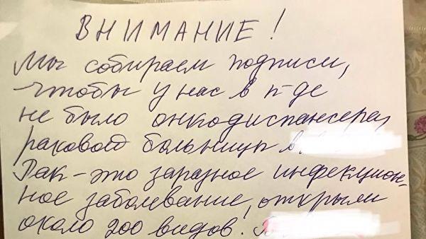 Старшая по подъезду Елена Аллина, узнав, что в доме обитают раковые больные, начала собирать подписи за их выселение. Женщина решила, что рак - это инфекционное заболевание, которым могут заразиться другие жильцы. Сообщается, что под требованием о выселении больных свои подписи поставили почти 50 квартир.