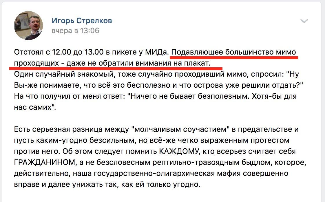 Россияне проигнорировали бывшего главаря боевиков "ДНР" Игоря Стрелкова-Гиркина, одиноко протестующего против передачи Японии Курильских островов.