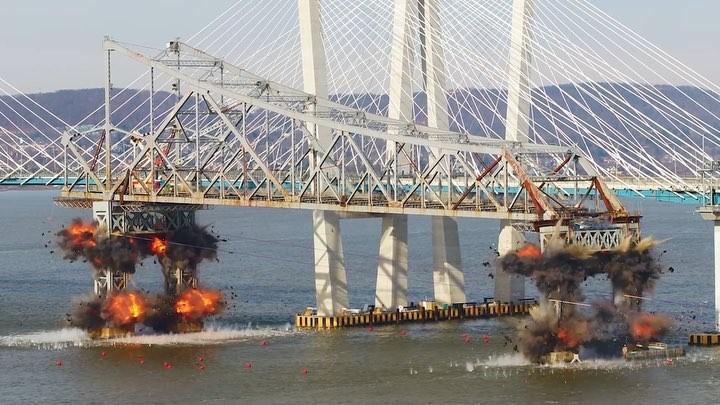 В американском городе Нью-Йорк взорвали исторический мост Tappan Zee. Взрывом разрушен большой участок 64-летнего моста. Взрыв устроили целенаправленно, чтобы снести старый мост.