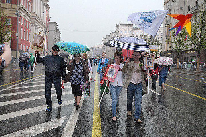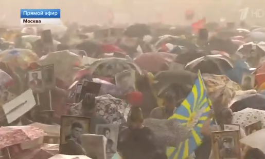 Акция "Бессмерный полк" состоялась, но ее участники скрывались под зонтами и непромокаемыми плащами, пока дождь с градом шел стеной. Соответствующие кадры попали в прямую трансляцию росТВ.