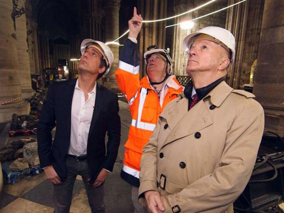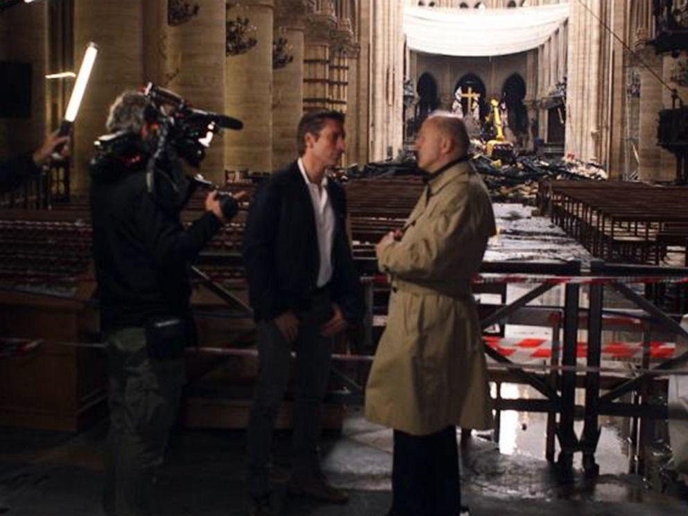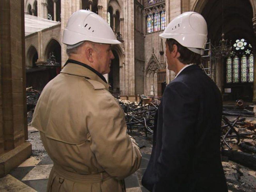 Ведущий "World News Tonight" Дэвид Мьюир был первым телевизионным журналистом, допущенным внутрь после разрушительного пожара, войдя в церковь с отставным французским генералом Жан-Луи Жоржеленом, которого Макрон выбрал для руководства восстановлением легендарной церкви.