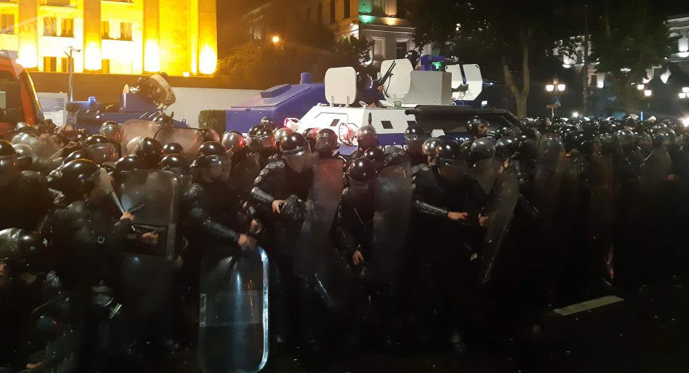 Сотрудники спецназа МВД Грузии в пятницу ночью приступили к разгону демонстрантов у здания парламента Грузии на проспекте Руставели в Тбилиси водой.