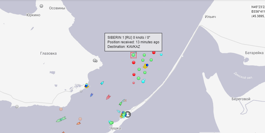 Российский теплоход Siberin 1 сел на мель в Керченском проливе недалеко от косы Чушка.