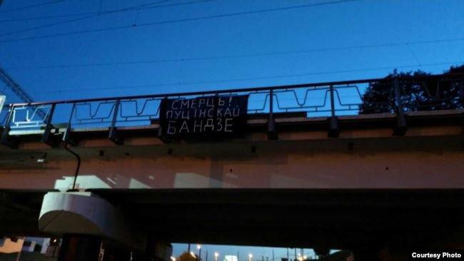 "На мостах в Минске вывесили антипутинские растяжки. Сегодня он приедет на закрытие Европейских игр", - сказано в сообщении.